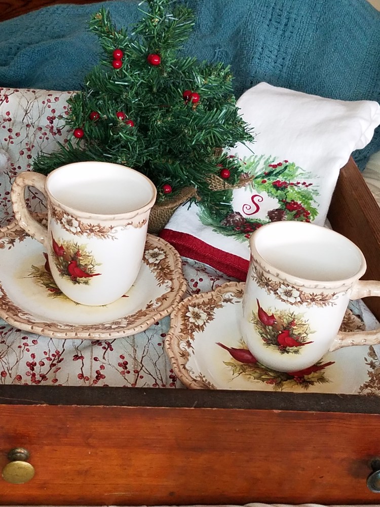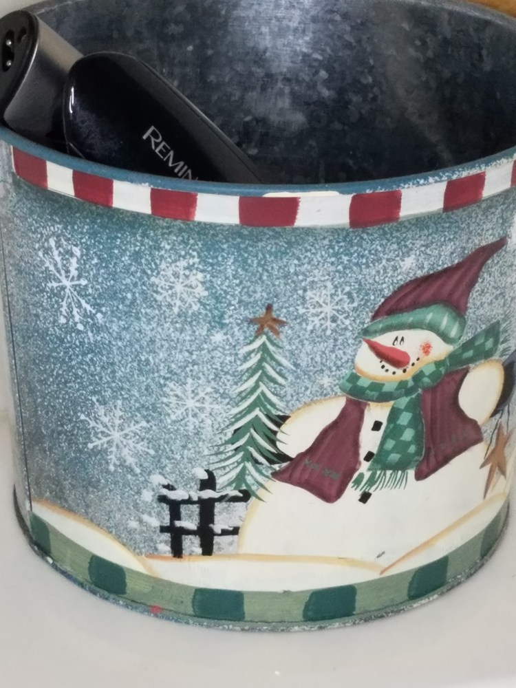 Thrifted finds interject the winter coziness throughout the different rooms. An old drawer sits on the master bed displaying a berry tree and two tea cups and saucers. I love the browns and reds that welcome the winter’s yearning for something warm to drink before settling in for the night. A snowman pail allows easy reach for my husband’s toiletry during his morning routine. Lastly, plates marked with familiar names greet the owners as he or she comes to the table for a home cooked meal.