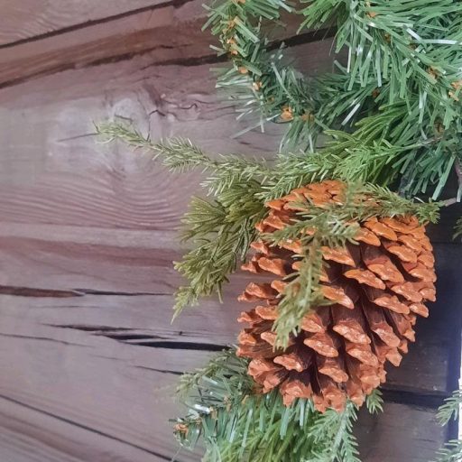Changing the seasonal greenery compliments the rustic appeal of our home. A touch of accents such as pinecones, berries and/or ribbon intertwined with the greenery brings out the different wooden tones.