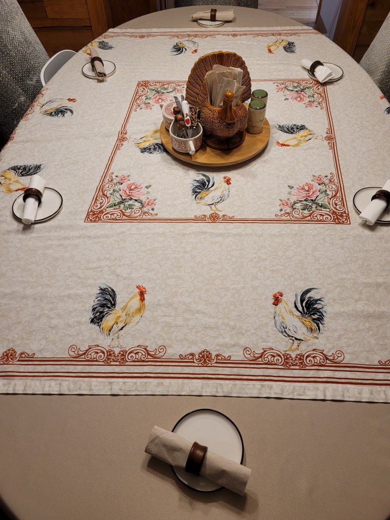 Different themed tablecloths: 1) rooster [late mother-in-law’s] 2) apple 3) harvest [table runner sewn by my mother]