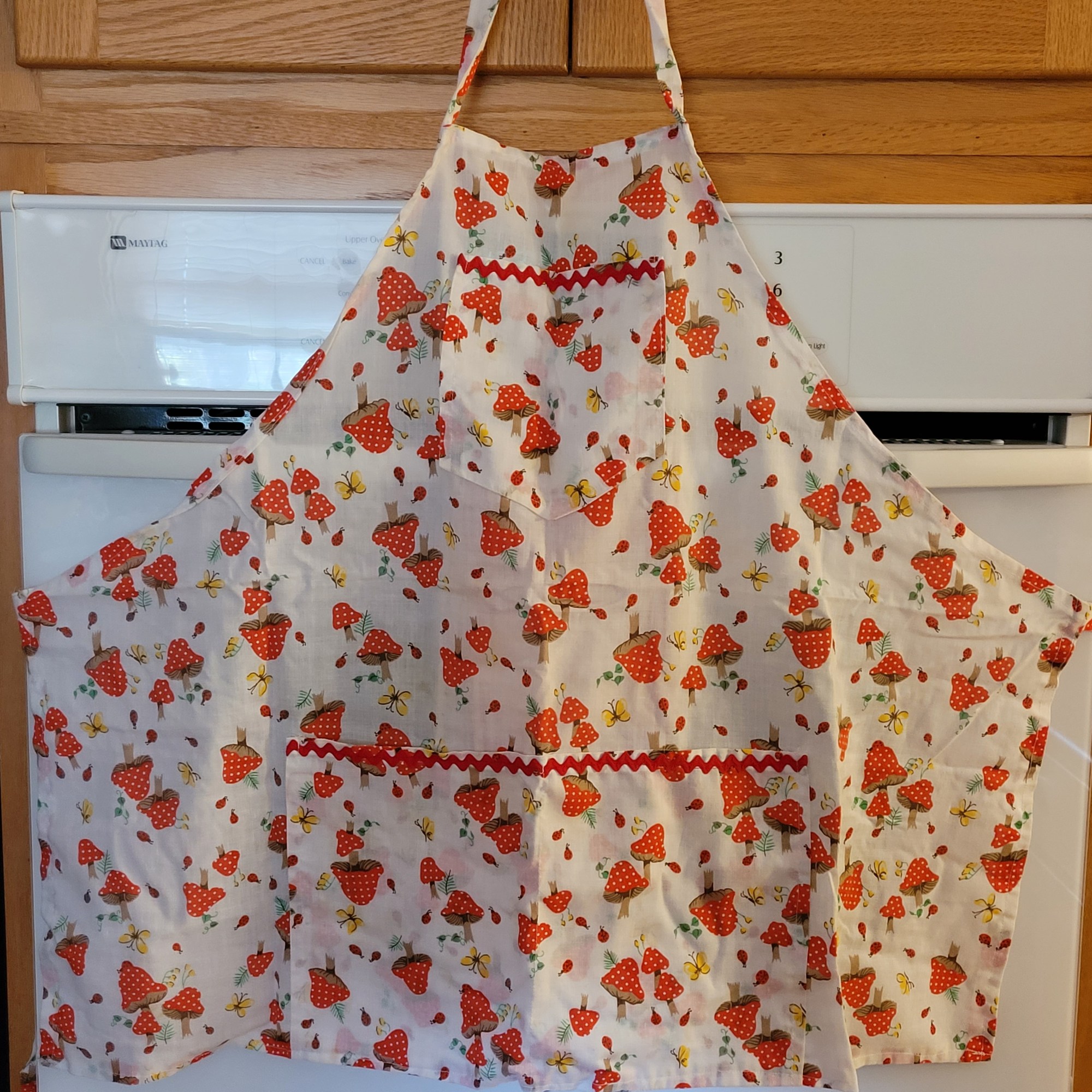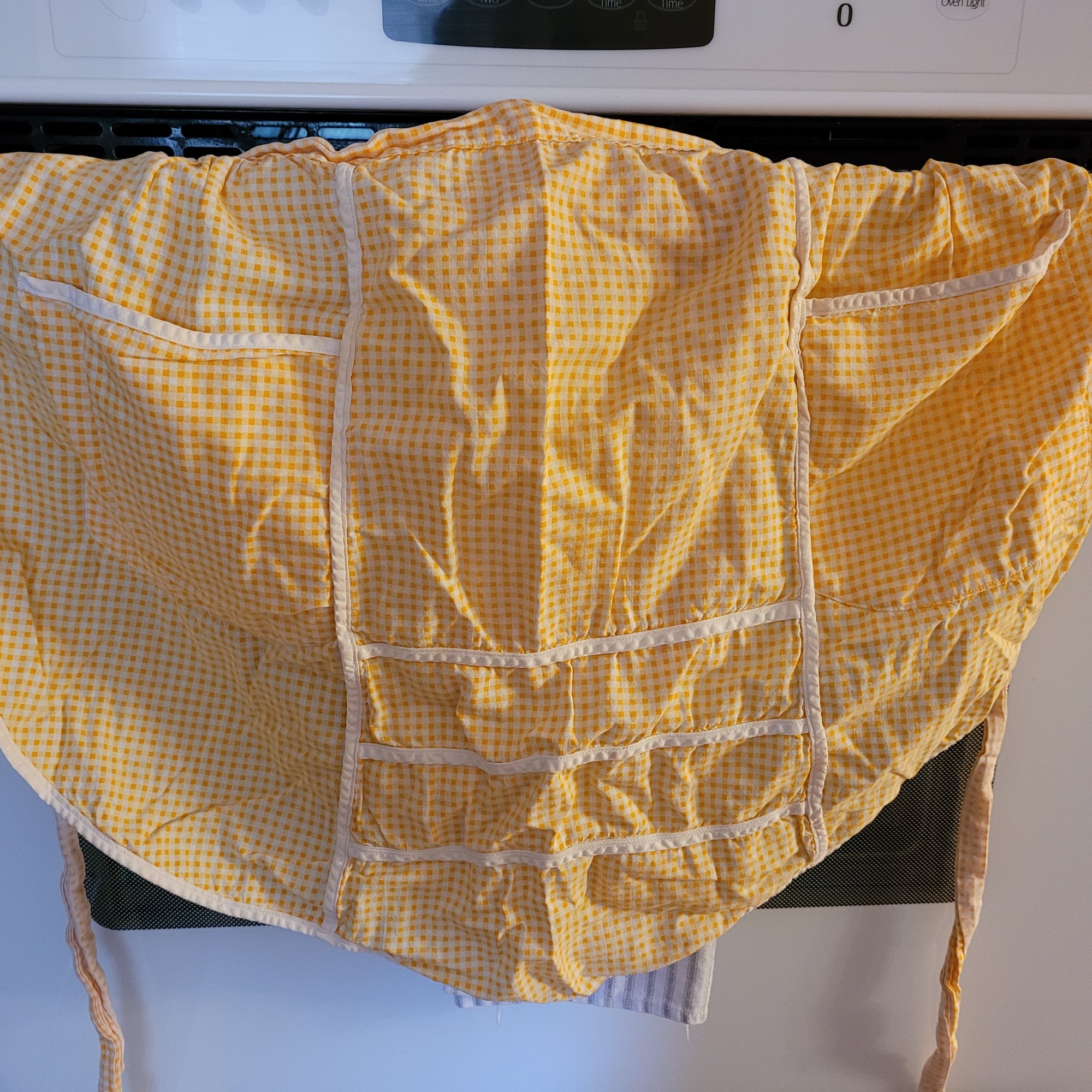 I sewed my first apron when I was in sixth grade, and it rests among my other apron assortment. The apron demonstrates a beginner’s trial yet carries the burgeoning enjoyment of many sewn projects hence.