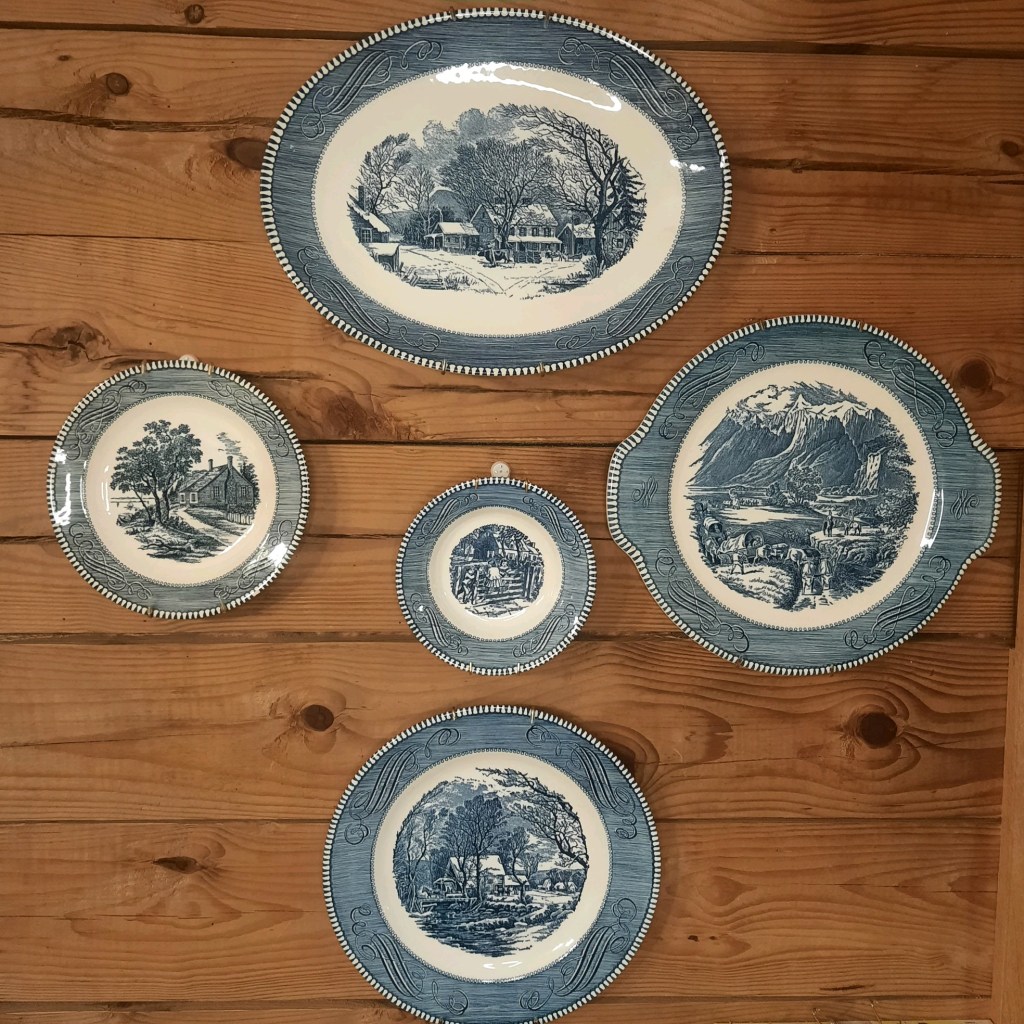 Currier & Ives pieces hang on my wall at the end of the kitchen cabinets. I recall seeing similar pieces in familiar kitchens. This, too, is a slow journey in gathering pieces. I find a dish here and there but not many collections.